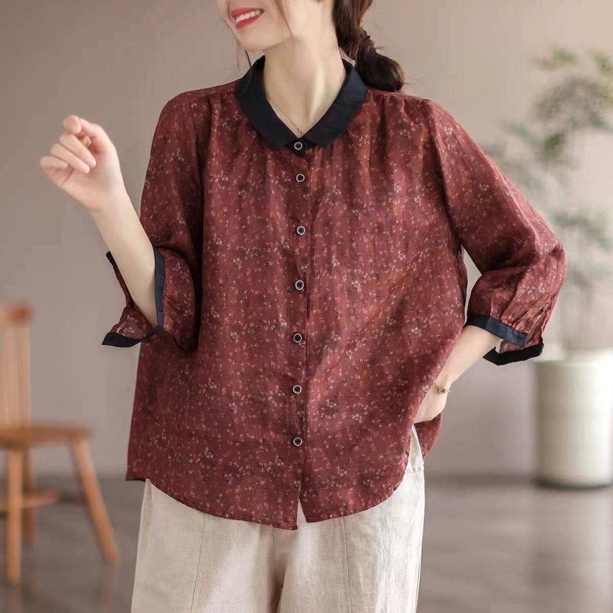 신상 여름 여성복 프린트 셔츠 코튼 마 문예 멜란 가디건 칼라 칠부 소매 캐주얼 셔츠녀